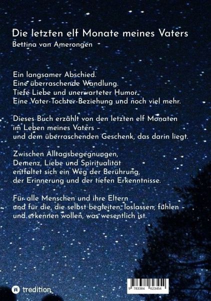 Dieses Buch erzählt in poetischer Tiefe und bewegender Ehrlichkeit von den letzten elf Monaten im Leben eines dementen Vaters - und vom inneren Weg seiner Tochter. Zwischen Begegnung, Rückblick und spiritueller Erkenntnis entfaltet sich ein Mosaik aus Liebe, Humor, Sterblichkeit und Transformation. Die Autorin verbindet persönliche Erlebnisse mit therapeutischem Wissen und spiritueller Orientierung. Das Buch schenkt den Lesern einen überraschend leichten und intimen Zugang zu einem existenziellen Thema: Wie können wir unsere Eltern auf ihrem letzten Weg begleiten und dabei selbst innerlich wachsen? Und es lässt aufatmen, wenn die entstehenden Dynamiken dieses Abschiedsprozesses in Einfachheit durchleuchtet und verstanden werden. So lädt es ein, alte Familienwunden zu heilen und Mut für den Umgang mit Demenz, Abschied und Beziehung zu schöpfen.