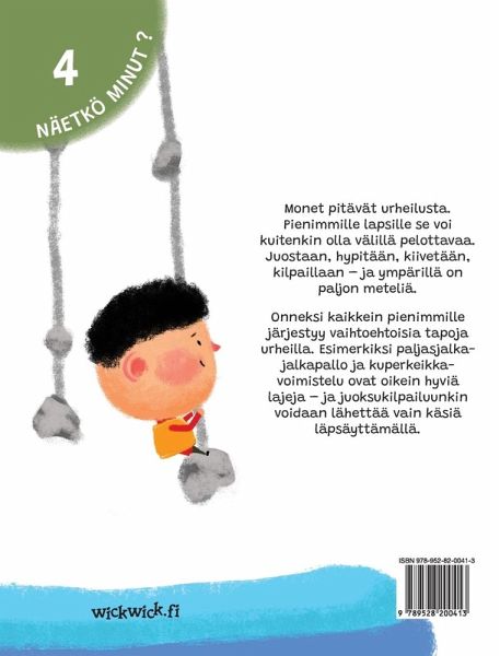 Monet pitävät urheilusta. Pienimmille lapsille se voi kuitenkin olla välillä pelottavaa. Juostaan, hypitään, kiivetään, kilpaillaan - ja ympärillä on paljon meteliä. Onneksi kaikkein pienimmille järjestyy vaihtoehtoisia tapoja urheilla. Esimerkiksi paljasjalkajalkapallo ja kuperkeikkavoimistelu ovat oikein hyviä lajeja - ja juoksukilpailuunkin voidaan lähettää vain käsiä läpsäyttämällä. --- Many people like sports. But for young children, playing sports can be scary. Sports involve running, jumping, climbing, competing-and lots of noise. Fortunately, there are ways to help young children enjoy…mehr