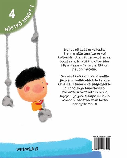 Monet pitävät urheilusta. Pienimmille lapsille se voi kuitenkin olla välillä pelottavaa. Juostaan, hypitään, kiivetään, kilpaillaan - ja ympärillä on paljon meteliä. Onneksi kaikkein pienimmille järjestyy vaihtoehtoisia tapoja urheilla. Esimerkiksi paljasjalkajalkapallo ja kuperkeikkavoimistelu ovat oikein hyviä lajeja - ja juoksukilpailuunkin voidaan lähettää vain käsiä läpsäyttämällä. --- Many people like sports. But for young children, playing sports can be scary. Sports involve running, jumping, climbing, competing-and lots of noise. Fortunately, there are ways to help young children enjoy…mehr