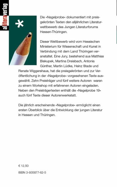 Die "Nagelprobe" dokumentiert mit preisgekrönten Texten den alljährlichen Literaturwettbewerb des Jungen Literaturforums Hessen-Thüringen. Dieser Wettbewerb wird vom Hessischen Ministerium für Wissenschaft und Kunst in Verbindung mit dem Land Thüringen veranstaltet. Eine Jury, bestehend aus Matthias Biskupek, Martina Dreisbach, Antonia Günther, Martin Lüdke, Heinz Stade und Renate Wiggershaus, hat die preisgekrönten und zur Veröffentlichung in der "Nagelprobe" vorgesehenen Texte ausgewählt. Zehn Preisträger und fünf weitere Autoren waren zu einem Workshop mit erfahrenen Autoren eingeladen. Neben den Preisträgertexten enthält die "Nagelprobe 19" auch fünf Texte dieser Autorenwerkstatt.