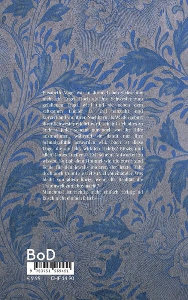 Elisabeth Angel war in ihrem Leben vieles, nur nicht ein Engel. Doch als ihre Schwester zum gefallenen Engel wird und sie neben dem seltsamen Lucifer D. Evil einzieht und kurzerhand von ihren Nachbarn als Wiedergeburt ihrer Schwester erklärt wird, scheint sich alles zu ändern. Jeder scheint nur noch von ihr Hilfe anzunehmen, während sie damit nur ihre Schuldgefühle loswerden will. Doch ist diese Lüge, die sie lebt, wirklich richtig? Und was wird aus den Menschen, wenn sie herausfinden, dass all die netten Worte von ihr, die vielen neue Hoffnung geschenkt haben, nur eine Lüge sind? Einzig und allein James Lucifer D. Evil scheint Antworten zu wissen. So nah dem Himmel wie nie zuvor sind beide für den jeweils anderen der letzte Halt, doch noch trennt sie viel zu viel voneinander. Was bleibt von allem übrig, wenn die Realität die Traumwelt zunichte macht? Manchmal ist richtig nicht einfach richtig und falsch nicht einfach falsch---