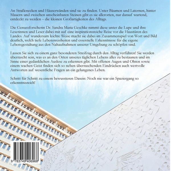 An Straßenecken und Häuserwänden sind sie zu finden. Unter Bäumen und Laternen, hinter Mauern und zwischen unscheinbaren Steinen gibt es sie allerorten, nur darauf wartend, entdeckt zu werden - die kleinen Großartigkeiten des Alltags. Die Genussforscherin Dr. Sandra Maria Geschke nimmt diese unter die Lupe und ihre Leserinnen und Leser dabei mit auf eine inspirationsreiche Reise vor die Haustüren des Landes. Auf wundersam leichte Weise macht sie dabei im Zusammenspiel von Wort und Bild deutlich, welch tiefe Lebensweisheiten und essentielle Erkenntnisse für die eigene Lebensgestaltung aus den Nahaufnahmen unserer Umgebung zu schöpfen sind. Lassen Sie sich zu einem ganz besonderen Streifzug durch den Alltag verführen! Sie werden überrascht sein, was es an den Orten unseres täglichen Lebens alles zu bestaunen und im Sinne einer gedanklichen Auslese zu erkennen gibt. Mit offenen Augen und Ohren sowie einem wachen Geist finden sich so neben überraschenden Eindrücken auch wertvolle Antworten auf wesentliche Fragen an ein gelungenes Leben. Schritt für Schritt zu einem bewussteren Dasein: Noch nie war ein Spaziergang so erkenntnisreich!