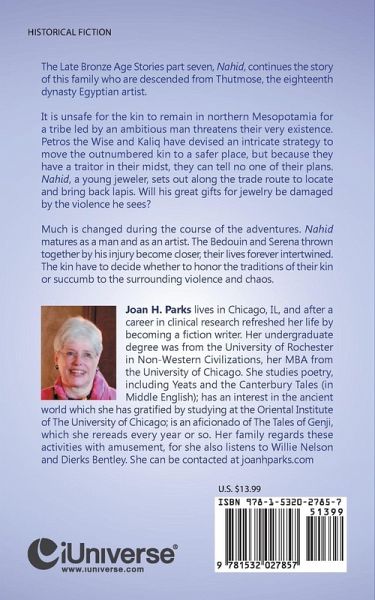 The Late Bronze Age Stories part seven, Nahid, continues the story of this family who are descended from Thutmose, the eighteenth dynasty Egyptian artist. It is unsafe for the kin to remain in northern Mesopotamia for a tribe led by an ambitious man threatens their very existence. Petros the Wise and Kaliq have devised an intricate strategy to move the outnumbered kin to a safer place, but because they have a traitor in their midst, they can tell no one of their plans. Nahid, a young jeweler, sets out along the trade route to locate and bring back lapis. Will his great gifts for jewelry be damaged by the violence he sees? Much is changed during the course of the adventures. Nahid matures as a man and as an artist. The Bedouin and Serena thrown together by his injury become closer, their lives forever intertwined. The kin have to decide whether to honor the traditions of their kin or succumb to the surrounding violence and chaos.