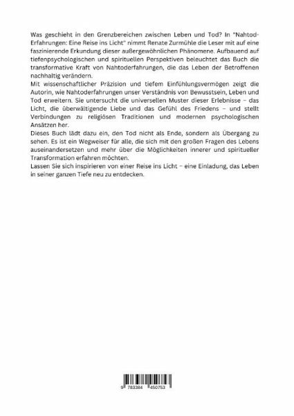 Was geschieht in den Grenzbereichen zwischen Leben und Tod? In "Nahtod-Erfahrungen: Eine Reise ins Licht" nimmt Renate Zurmühle die Leser mit auf eine faszinierende Erkundung dieser außergewöhnlichen Phänomene. Aufbauend auf tiefenpsychologischen und spirituellen Perspektiven beleuchtet das Buch die transformative Kraft von Nahtoderfahrungen, die das Leben der Betroffenen nachhaltig verändern.Mit wissenschaftlicher Präzision und tiefem Einfühlungsvermögen zeigt die Autorin, wie Nahtoderfahrungen unser Verständnis von Bewusstsein, Leben und Tod erweitern. Sie untersucht die universellen Muster dieser Erlebnisse - das Licht, die überwältigende Liebe und das Gefühl des Friedens - und stellt Verbindungen zu religiösen Traditionen und modernen psychologischen Ansätzen her.Dieses Buch lädt dazu ein, den Tod nicht als Ende, sondern als Übergang zu sehen. Es ist ein Wegweiser für alle, die sich mit den großen Fragen des Lebens auseinandersetzen und mehr über die Möglichkeiten innerer undspiritueller Transformation erfahren möchten.Lassen Sie sich inspirieren von einer Reise ins Licht - eine Einladung, das Leben in seiner ganzen Tiefe neu zu entdecken.