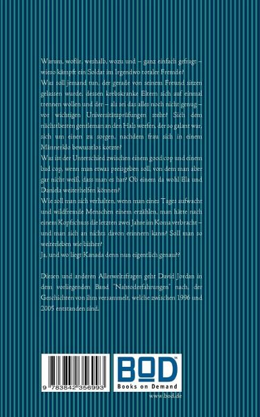 Warum, wofür, weshalb, wozu und - ganz einfach gefragt - wieso kämpft ein Soldat im Irgendwo totaler Fremde? - Was soll jemand tun, der gerade von seinem Freund sitzen gelassen wurde, dessen krebskranke Eltern sich auf einmal trennen wollen und der - als sei das alles noch nicht genug - vor wichtigen Universitätsprüfungen steht? Sich dem nächstbesten Gentleman an den Hals werfen, der so galant war, sich um einen zu sorgen, nachdem frau sich in einem Männerklo bewusstlos kotzte? - Was ist der Unterschied zwischen einem good cop und einem bad cop, wenn man etwas preisgeben soll, von dem man aber gar nicht weiß, dass man es hat? Ob einem da wohl Ela und Daniela weiterhelfen können? - Wie soll man sich verhalten, wenn man eines Tages aufwacht und wildfremde Menschen einem erzählen, man hätte nach einem Kopfschuss die letzten zwei Jahre im Koma verbracht - und man sich an nichts davon erinnern kann? Soll man so weiterleben wie bisher? - Ja, und wo liegt Kanada denn nun eigentlich genau?? - All diesen und einigen anderen Allerweltsfragen geht David Jordan in dem vorliegenden Band "Nahtoderfahrungen" nach, der Geschichten von ihm versammelt, welche zwischen 1996 und 2005 entstanden sind.