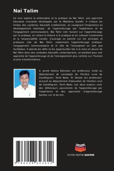 Ce livre explore la philosophie et la pratique du Nai Talim, une approche éducative innovante développée par le Mahatma Gandhi. Il critique les limites des systèmes éducatifs traditionnels, en soulignant l'importance du développement holistique, de l'apprentissage par l'expérience et de l'engagement communautaire. Nai Talim met l'accent sur l'apprentissage par la pratique, en reliant la théorie à la pratique et en cultivant l'autonomie et la responsabilité sociale. L'ouvrage se penche sur les principes et pratiques clés de Nai Talim, notamment l'apprentissage pratique, l'engagement communautaire et le rôle de l'enseignant en tant que facilitateur. Il aborde les défis et les opportunités liés à la mise en oeuvre de Nai Talim dans des contextes éducatifs contemporains, en plaidant pour une approche de l'apprentissage et de l'enseignement plus centrée sur l'humain et plus transformatrice.