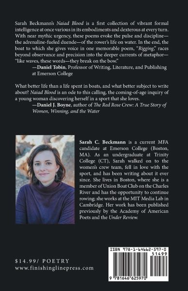 Naiad Blood, a first collection of poetry by Sarah C. Beckmann, describes the story of a young woman who discovers herself in the sport of rowing-although she grew up near the sea, she falls in love with boats and the water all over again, in a whole new way. Crew not only provides her with an avenue for personal growth, but also alters her outlook on life. Taking creative inspiration from Greek myths and other cultural ideas around womanhood, Naiad Blood acknowledges social norms and issues that women face, and also directly challenges them. These poems embrace change, freedom, and power; they demonstrate that women should be able to engage with masculinized realms-to gain muscle or cut off their hair. And these poems are also an ode to the sport itself, to the magical and spiritual aura that the experience of being in a boat, and being on the water lends.