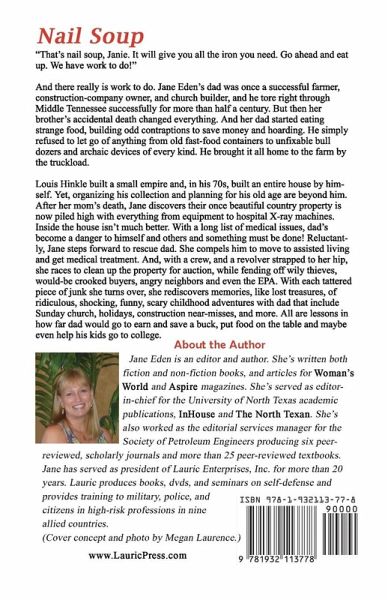 "That's nail soup, Janie. It will give you all the iron you need. Go ahead and eat up. We have work to do!" And there really is work to do. Jane Eden's dad was once a successful farmer, construction-company owner, and church builder, and he tore right through Middle Tennessee successfully for more than half a century. But then her brother's accidental death changed everything. And her dad started eating strange food, building odd contraptions to save money, and hoarding. He simply refused to let go of anything from old fast-food containers to unfixable bull dozers and archaic devices of every kind. He brought it all home to the farm by the truckload. Louis Hinkle built a small empire and an entire house by himself in his late 70s. Yet, organizing his collection and planning for his old age is beyond him. After her mom's death, Jane discovers their once beautiful country property is now piled high with everything from heavy equipment to hospital X-ray machines. Inside the house isn't much better. With a long list of medical issues, dad's become a danger to himself and others, and something must be done! Reluctantly, Jane steps forward to rescue dad. She compels him to move to assisted living and get the medical help he needs. And, with a crew-and a revolver strapped to her hip-she races to clean up the acreage for auction, while fending off wily thieves, would-be crooked buyers, and her dad's old business enemies. With each tattered piece of junk she turns over, she rediscovers memories, like lost treasures, of ridiculous, funny, scary childhood adventures with dad that include Sunday church, holidays, construction near-misses, and more. All are lessons in how far her dad will go to save, to earn a buck, to put food on the table, and maybe even help his kids go to college.