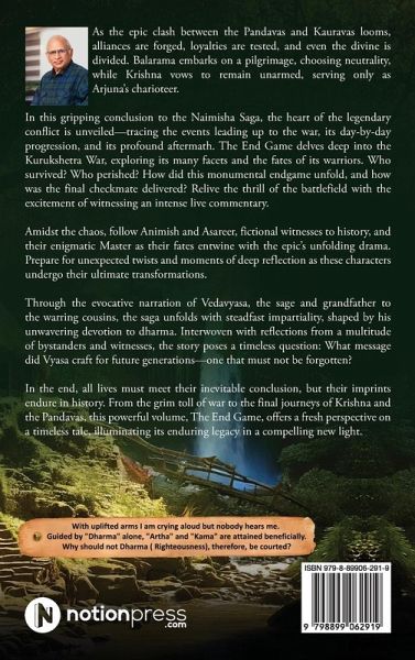 As the epic clash between the Pandavas and Kauravas looms, alliances are forged, loyalties are tested, and even the divine is divided. Balarama embarks on a pilgrimage, choosing neutrality, while Krishna vows to remain unarmed, serving only as Arjuna's charioteer. In this gripping conclusion to the Naimisha Saga, the heart of the legendary conflict is unveiled-tracing the events leading up to the war, its day-by-day progression, and its profound aftermath. The End Game delves deep into the Kurukshetra War, exploring its many facets and the fates of its warriors. Who survived? Who perished? How did this monumental endgame unfold, and how was the final checkmate delivered? Relive the thrill of the battlefield with the excitement of witnessing an intense live commentary. Amidst the chaos, follow Animish and Asareer, fictional witnesses to history, and their enigmatic Master as their fates entwine with the epic's unfolding drama. Prepare for unexpected twists and moments of deep reflection as these characters undergo their ultimate transformations. Through the evocative narration of Vedavyasa, the sage and grandfather to the warring cousins, the saga unfolds with steadfast impartiality, shaped by his unwavering devotion to dharma. Interwoven with reflections from a multitude of bystanders and witnesses, the story poses a timeless question: What message did Vyasa craft for future generations-one that must not be forgotten? In the end, all lives must meet their inevitable conclusion, but their imprints endure in history. From the grim toll of war to the final journeys of Krishna and the Pandavas, this powerful volume, The End Game, offers a fresh perspective on a timeless tale, illuminating its enduring legacy in a compelling new light.