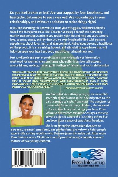 Do you feel broken or lost? Are you trapped by fear, loneliness, and heartache, but unable to see a way out? Are you unhappy in your relationships, and without a solution to make things right? If you are searching for answers to all of your struggles, Vladimire Calixte’s Naked and Transparent: Six Vital Tools for Knowing Yourself and Attracting Healthy Relationships can help you reclaim your life and help you attract more love, success, peace, and joy than you’ve ever imagined! Filled with personal experiences about love, loss, and abandonment, Naked goes beyond a traditional self-help book. It is a refreshing, honest, and stimulating experience that will help you open your heart and soul, and discover a brand-new you! Part workbook and part memoir, Naked is an enjoyable yet informative must-read for women, men, and teens who suffer from low self-esteem, unworthiness, anxiety, shame, guilt, feelings of failure, and toxic relationships.