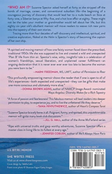At age thirty-nine, Suzanne Spector found herself looking at what conventional 1950s thinking had brought her. Yes, she was a wife, mother of three, and successful school director. But she was also neglected in a sexless marriage, and feeling and as if the passion and juice of life had passed her by. She began with two questions: Who am I, really? and Is it too late ? After divorcing her husband, Suzanne set out to discover who she was as an independent woman with curiosity, questions, and lust for life. Tracing more than four decades of self-discovery and intellectual, spiritual, and creative exploration, Naked at The Helm is Spector's story of becoming the captain of her own ship in midlife. Her adventurous journey led her from a nude beach on Ibiza at forty-one to a Siberian banya at fifty-five to a hot love affair at eighty. Her intellectual quest, meanwhile, led to a second career as director of a world-renowned psychology center, while deep friendships with women, including her daughters, sustained and nourished her through decades of global travel. These probably would not be the tales your mother or grandmother would tell about her life, but this eighty-six-year old's ebullient memoir of the second half of her life will move you to weave some rich new yarns into the tapestry of your own story. And no, it's not too late.