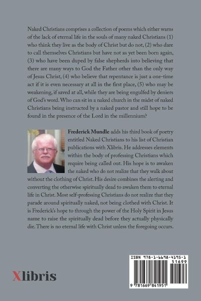 Naked Christians comprises a collection of poems which either warns of the lack of eternal life in the souls of many naked Christians (1) who think they live as the body of Christ but do not, (2) who dare to call themselves Christians but have not as yet been born again, (3) who have been duped by false shepherds into believing that there are many ways to God the Father other than the only way of Jesus Christ, (4) who believe that repentance is just a one-time act if it is even necessary at all in the first place, (5) who may be weakening, if saved at all, while they are being engulfed by deniers of God's word. Who can sit in a naked church in the midst of naked Christians being instructed by a naked pastor and still hope to be found in the presence of the Lord in the millennium?