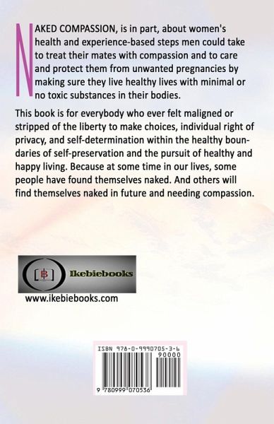NAKED COMPASSION is primarily about women's reproductive health and experience-based steps men should take to help their mates prevent unintended and unwanted pregnancies and toxic substances from getting in their women's bodies. Beyond that, it is for everybody who ever felt maligned or denied the liberty to make choices, individual right of privacy, and self-determination within the normal boundaries of self-preservation and the pursuit of healthy and happy living. Because at some time in our lives, some people have found themselves naked. And others will find themselves naked and needing compassion.