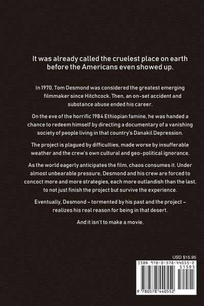 It was already called the cruelest place on earth before the Americans even showed up. In 1970, Tom Desmond was considered the greatest emerging filmmaker since Hitchcock. Then, an on-set accident and substance abuse ended his career. On the eve of the horrific 1984 Ethiopian famine, he was handed a chance to redeem himself by directing a documentary of a vanishing society of people living in that country’s Danakil Depression. The project is plagued by difficulties, made worse by insufferable weather and the crew’s own cultural and geo-political ignorance. As the world eagerly anticipates the film, chaos consumes it. Under almost unbearable pressure, Desmond and his crew are forced to concoct more and more strategies, each more outlandish than the last, to not just finish the project but survive the experience. Eventually, Desmond – tormented by his past and the project – realizes his real reason for being in that desert. And it isn’t to make a movie.