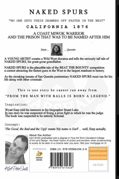 An 1876 Californian tale of a Coast Miwok Warrior named 'Quentin' AKA 'Naked Spurs' ~ In the present... a YOUNG ARTIST creates a Wild West diorama and tells the seriously tall tale of NAKED SPURS his great-great grandfather. ~ As the streaking inmate of San Quentin penitentiary 'Naked Spurs' must run for his life along with other criminals; this is one story he can not run away from. NAKED SPURS is the plausible tale of the BEAT THE BOUNTY competition, a contest attracting the fastest guns in the west to the largest man-hunt in history.