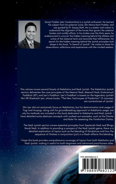 This volume covers several facets of Nakshatra and Nadi Jyotisha. The Nakshatra Jyotisha delineates the core principles of the Meena1 Nadi, Meena2 Nadi, Krishnamurti Paddhati (KP) and Iyer's Paddhati. Iyer's Paddhati is based on the legendary Jyotishi Sri HR Sheshadri Iyer, whose books, the New Techniques of Prediction 3 volumes, are cornerstones of Jyotisha. Sri Iyer did not exclusively deal with the Nakshatras. Still, his determination and usage of Yogi and Avayogi and the usage of Nakshatra is pathbreaking, which is why it is included in this book dedicated to Nakshatra and Nadi Jyotisha. I have covered in detail some abstruse concepts with worked-out examples, such as the Starter and Ruler for assessment of Vimshottari Dasha. The Nadi Jyotisha section covers the essential principles from Saptarishi Nadi and Bhrigu Nandi Nadi. Besides providing a synopsis of the genre of Nadi Jyotisha, there is a detailed exploration of topics such as the blending of Karakatvas and how the blending is affected by the sequence of Grahas having yuti in a Rashi. I hope that this book will provide wide coverage of topics from both Nakshatra and Nadi Jyotisha that both beginners and advanced practitioners would find useful.
