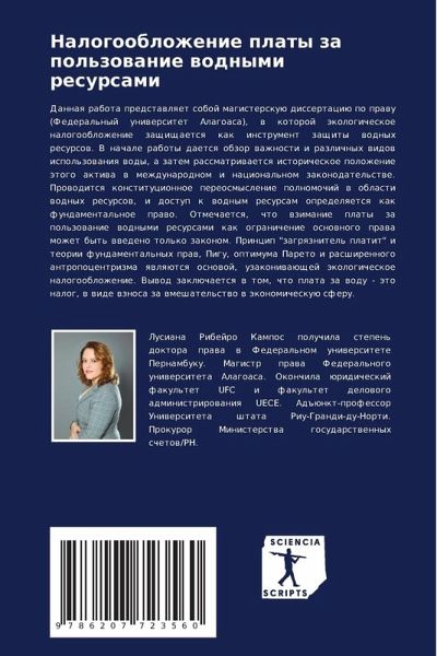Dannaq rabota predstawlqet soboj magisterskuü dissertaciü po prawu (Federal'nyj uniwersitet Alagoasa), w kotoroj äkologicheskoe nalogooblozhenie zaschischaetsq kak instrument zaschity wodnyh resursow. V nachale raboty daetsq obzor wazhnosti i razlichnyh widow ispol'zowaniq wody, a zatem rassmatriwaetsq istoricheskoe polozhenie ätogo aktiwa w mezhdunarodnom i nacional'nom zakonodatel'stwe. Prowoditsq konstitucionnoe pereosmyslenie polnomochij w oblasti wodnyh resursow, i dostup k wodnym resursam opredelqetsq kak fundamental'noe prawo. Otmechaetsq, chto wzimanie platy za pol'zowanie wodnymi resursami kak ogranichenie osnownogo prawa mozhet byt' wwedeno tol'ko zakonom. Princip "zagrqznitel' platit" i teorii fundamental'nyh praw, Pigu, optimuma Pareto i rasshirennogo antropocentrizma qwlqütsq osnowoj, uzakoniwaüschej äkologicheskoe nalogooblozhenie. Vywod zaklüchaetsq w tom, chto plata za wodu - äto nalog, w wide wznosa za wmeshatel'stwo w äkonomicheskuü sferu.
