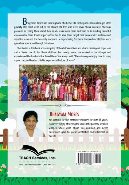 Bhagyam's desire was to bring hope of a better life to the poor children living in utter poverty. Her heart went out to the abused children who were never shown any love. She took pleasure in telling them about how much Jesus loves them and that He is building beautiful mansions for them. It was important for her to have them forget their current circumstance and visualize Jesus and the heavenly mansions He is preparing for them. Hundreds of children were given free education through this vision. The stories in this book are a sampling of the children's lives and what a message of hope, love and a Savior can do for these children. For twenty years, she worked in the villages and experienced the hardship that faced them. She always said, "There is no greater joy than to bring a poor, sad, and beaten child to experience the love of Jesus."