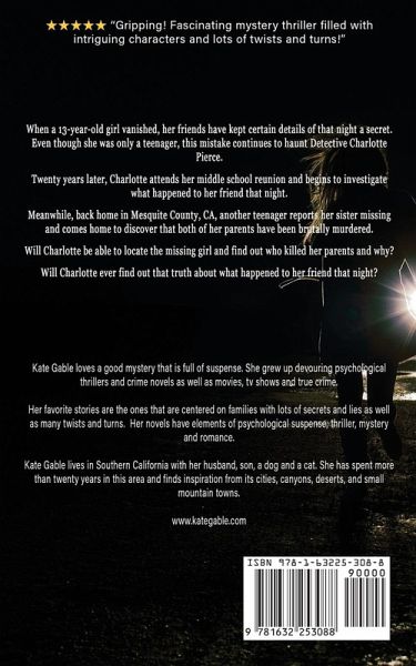 When a 13-year-old girl vanished, her friends have kept certain details of that night a secret. Even though she was only a teenager, this mistake continues to haunt Detective Charlotte Pierce. Twenty years later, Charlotte attends her middle school reunion and begins to investigate what happened to her friend that night. Meanwhile, back home in Mesquite County, CA, another teenager reports her sister missing and comes home to discover that both of her parents have been brutally murdered. Will Charlotte be able to locate the missing girl and find out who killed her parents and why? Will Charlotte ever find out that truth about what happened to her friend that night? Praise for Kate Gable's Girl Missing Series ¿¿¿¿¿"Gripping! This book was a great read. I found a new author that I enjoy and I can't wait to read the rest of the series! " (Goodreads) ¿¿¿¿¿ "The twists come at you at breakneck pace. Very suspenseful." (Goodreads) ¿¿¿¿¿ "I really enjoyed the ins and outs of the storyline, it kept me reading so that I could find out how the story would turn out. And the ending was a major shocker, I never saw it coming. I truly recommend this book to everyone who loves mysteries and detective stories." (Goodreads) ¿¿¿¿¿" I loved it. One of the best books I've ever read." (Goodreads) ¿¿¿¿¿ "I couldn't put the book down I give it a thumbs up and I would recommend it to other readers" (Goodreads) ¿¿¿¿¿ "Another great book in the Kaitlyn Carr series! I am so drawn into these books. I love that they are not just about Kaitlyn's search for her sister but also about a case she is working on. I can't wait for the final book in the series!" (Goodreads)