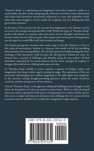 "Nameless King" is a captivating and imaginative novel that transports readers to a world unlike any other. In this intriguing tale, all known races from various dimensions and realms find themselves mysteriously teleported to a new and unfamiliar world, where they must struggle to survive amidst the enigmatic and ever-shifting rules that govern their existence. At the heart of this narrative lies the concept that imagination is the ultimate tool for survival in this strange and unpredictable world. Within the pages of "Nameless King," readers will embark on a journey where the power of one's thoughts and dreams can become reality, but not without a price. This unique twist on the power of imagination sets the stage for a world filled with both wonder and danger. Our fearless protagonist, Arumat, takes center stage in this tale. Known as a hero in this realm of uncertainties, Arumat is a character who stands out for his unyielding determination and cunning abilities. His relentless pursuit of understanding the inner workings of this fantastical world becomes the driving force behind the story. As Arumat faces a myriad of challenges and obstacles along the way, readers will find themselves captivated by his resourcefulness and the clever strategies he employs to navigate this world of ever-shifting landscapes and rules. As "Nameless King" unfolds, it weaves together a tapestry of intrigue, action, and imagination that keeps readers eagerly turning the pages. The exploration of the cost associated with bringing one's wildest imaginings to life adds depth and complexity to the narrative, raising thought-provoking questions about the nature of power, creativity, and the consequences of one's choices. Overall, "Nameless King" is a thought-provoking and thrilling journey through a world where the boundaries of reality are pushed to their limits. With its richly developed characters and its exploration of the power of imagination, it is a must-read for anyone who craves a unique and immersive adventure that challenges the very essence of what it means to survive and thrive in a world where imagination reigns supreme.