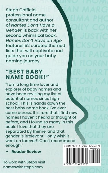 Feeling stuck and frustrated with traditional, tiresome baby name books? Having difficulty finding a name that works for both you AND your partner? Do you wish you could see more uncommon baby names? Or maybe you can't find THE ONE, and you want to explore new naming styles? Refresh your baby name search with a whimsical and genderless approach! Steph Coffield, professional name consultant and author of Names Don't Have a Gender, is back with her second book to transform your naming experience. Names Don't Have an Age features 52 curated themed lists to guide you on an enchanting and inspirational naming journey. Unlike conventional gendered lists, Names Don't Have an Age is sectioned by popular and uncommon names, offering a unique and genderless way to search for the perfect name. From "Dinos & Dragons" to "Cottagecore", "Old Money" and "80's Flair", you'll be captivated from cover to cover by the delightful themes inside. Whether you're expecting a baby, searching for a top-notch gift, seeking character names for your next novel, or naming your newest plant, Names Don't Have an Age is the ultimate guide to discovering the perfect moniker.