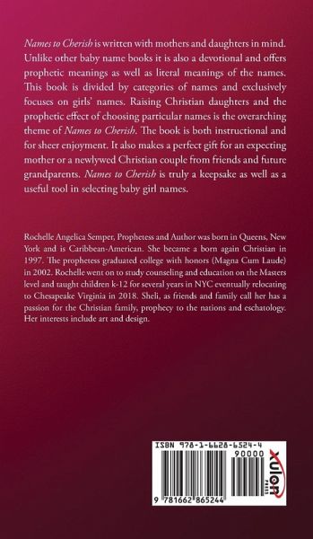Names to Cherish is written with mothers and daughters in mind. Unlike other baby name books it is also a devotional and offers prophetic meanings as well as literal meanings of the names. This book is divided by categories of names and exclusively focuses on girls' names. Raising Christian daughters and the prophetic effect of choosing particular names is the overarching theme of Names to Cherish. The book is both instructional and for sheer enjoyment. It also makes a perfect gift for an expecting mother or a newlywed Christian couple from friends and future grandparents. Names to Cherish is truly a keepsake as well as a useful tool in selecting baby girl names. Rochelle Angelica Semper, Prophetess and Author was born in Queens, New York and is Caribbean-American. She became a born again Christian in 1997. The prophetess graduated college with honors (Magna Cum Laude) in 2002. Rochelle went on to study counseling and education on the Masters level and taught children k-12 for several years in NYC eventually relocating to Chesapeake Virginia in 2018. Sheli, as friends and family call her has a passion for the Christian family, prophecy to the nations and eschatology. Her interests include art and design.