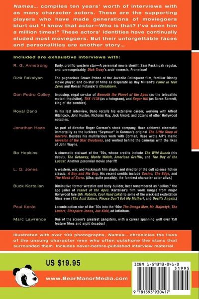 Names. compiles ten years' worth of interviews with as many character actors. These are the supporting players who have made generations of moviegoers blurt out "I know that actor- Who is that? I've seen him a million times!" These actors' identities have continually eluded most moviegoers. But their unforgettable faces and personalities are another story. Included are exhaustive interviews with: - R. G. Armstrong- Burly, prolific western star-- A perennial movie sheriff, Sam Peckinpah regular, and, unrecognizably, Dick Tracy's arch-nemesis, Pruneface! - Dick Bakalyan- The pugnacious Crown Prince of the Juvenile Delinquent film, familiar Disney movie player, and co-star of films as disparate as Ray Milland's Panic in Year Zero! and Roman Polanski's Chinatown. - Don Pedro Colley- Imposing, regal co-star of Beneath the Planet of the Apes (as the telepathic mutant inquisitor), THX-1138 (as a hologram), and Sugar Hill (as Baron Samedi, king of the zombies). - Royal Dano- In his last interview, Dano recalls his extensive career, working with Alfred Hitchcock, John Huston, Nicholas Ray, Jack Arnold, and dozens of other Hollywood notables. - Jonathan Haze- As part of director Roger Corman's stock company, Haze achieved cinematic immortality as the luckless "Seymour" in Corman's original The Little Shop of Horrors. Besides his multifarious work with Corman, Haze wrote AIP's manic Invasion of the Star Creatures, and worked behind the cameras with the likes of John Wayne. - Bo Hopkins- A cinematic stalwart of the '70s, whose credits include The Wild Bunch (his debut), The Getaway, Monte Walsh, American Graffiti, and The Day of the Locust. Another perennial movie sheriff! - L. Q. Jones- A western, war, and Peckinpah film staple, and director of the cult science fiction classic, A Boy and His Dog. His recent credits include Casino, The Edge, and The Mask of Zorro. (Also, quite possibly, the funniest character actor alive.) - Buck Kartalian- Diminutive former wrestler and body-builder, best remembered as "Julius," the ape jailer of Planet of the Apes. Kartalian's film work ranges from major Hollywood fare (Mr. Roberts, Cool Hand Luke) to some of the wackiest exploitation films ever (The Acid Eaters, Please Don't Eat My Mother!, and Devil's Angels.) - Paul Koslo- Laconic action star of the '70s into the '90s: The Omega Man, Mr. Majestyk, The Losers, Cleopatra Jones, Joe Kidd, ad infinitum. - Marc Lawrence- One of the screen's greatest gangsters, with a career spanning well over 150 feature films and eight decades! Illustrated with over 100 photographs, Names. chronicles the lives of the unsung character men who often outshone the stars that surrounded them. Includes never-before-published interview material.
