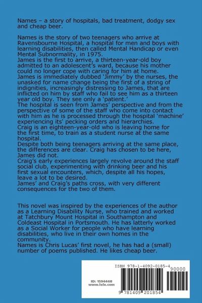 Names - a story of hospitals, bad treatment, dodgy sex and cheap beer, the story of 2 teenagers arriving at a hospital for men and boys with learning disabilities, then called mental handicap or mental subnormality, in 1975. James has a learning disability and the hospital is seen from his perspective and from that of the staff as he is processed through the hospital machine, experiencing its' pecking orders and hierarchies. Craig is an 18 year old who is leaving home for the first time, to train as a Student Nurse at the hospital. Despite both being teenagers arriving at the same place, the differences are clear. Craig has chosen to be here, James did not. Craig's life revolves around the staff social club, drinking beer and having his first, cringe-worthy sexual encounters. The story of these two teenagers, whose paths collide, highlights some of the issues of institutional care experienced by people with disabilities, James becoming the victim of sexual and physical abuse, from staff and patients.