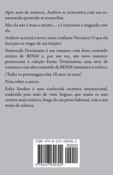 Após anos de ausência, Andrew se reencontra com sua ex-namorada querendo se reconciliar. Mas ela não é mais a mesma ... e é rancorosa e magoada com ele. Andrew aceitará a nova e mais confiante Veronica? O que ela fará para se vingar de sua traição? Namorada Dominante é um romance com forte conteúdo erótico de BDSM e, por sua vez, um novo romance pertencente à coleção Erotic Domination, uma série de romances com alto conteúdo de BDSM romântico e erótico. (Todos os personagens têm 18 anos ou mais) Nota sobre a autora Erika Sanders é uma conhecida escritora internacional, traduzida para mais de vinte línguas, que assina os seus escritos mais eróticos, longe da sua prosa habitual, com o seu nome de solteira.