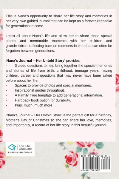 This is Nana's opportunity to share her life story and memories in her very own guided journal that can be kept as a forever keepsake for generations to come. Learn all about Nana's life and allow her to share those special stories and memorable moments with her children and grandchildren, reflecting back on moments in time that can often be forgotten between generations. 'Nana's Journal - Her Untold Story' provides:Guided questions to help bring together the special memories and stories of life from birth, childhood, teenage years, having children, career and questions that may never have been asked before about her life before. Spaces to provide photos and special memories. Inspirational quotes throughout. A Family Tree template to add generational information. Hardback book option for durability. Plus, much, much more... 'Nana's Journal - Her Untold Story' is the perfect gift for a birthday, Mother's Day or Christmas so she can share her love, memories, and importantly, a record of her life story in this beautiful journal.