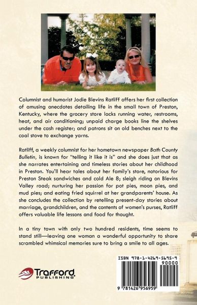 Columnist and humorist Jodie Blevins Ratliff offers her first collection of amusing anecdotes detailing life in the small town of Preston, Kentucky, where the grocery store lacks running water, restrooms, heat, and air conditioning; unpaid charge books line the shelves under the cash register; and patrons sit on old benches next to the coal stove to exchange yarns. Ratliff, a weekly columnist for her hometown newspaper Bath County Bulletin, is known for "telling it like it is" and she does just that as she narrates entertaining and timeless stories about her childhood in Preston. You'll hear tales about her family's store, notorious for Preston Steak sandwiches and cold Ale 8; sleigh riding on Blevins Valley road; nurturing her passion for pot pies, moon pies, and mud pies; and eating fried squirrel at her grandparents' house. As she concludes the collection by retelling present-day stories about marriage, grandchildren, and the contents of women's purses, Ratliff offers valuable life lessons and food for thought. In a tiny town with only two hundred residents, time seems to stand still-leaving one woman a wonderful opportunity to share scrambled whimsical memories sure to bring a smile to all ages.