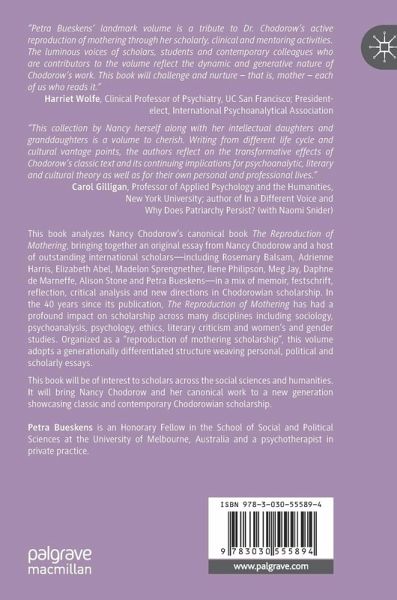 This book analyzes Nancy Chodorow's canonical book The Reproduction of Mothering, bringing together an original essay from Nancy Chodorow and a host of outstanding international scholars-including Rosemary Balsam, Adrienne Harris, Elizabeth Abel, Madelon Sprengnether, Ilene Philipson, Meg Jay, Daphne de Marneffe, Alison Stone and Petra Bueskens-in a mix of memoir, festschrift, reflection, critical analysis and new directions in Chodorowian scholarship. In the 40 years since its publication, The Reproduction of Mothering has had a profound impact on scholarship across many disciplines including sociology, psychoanalysis, psychology, ethics, literary criticism and women's and gender studies. Organized as a "reproduction of mothering scholarship", this volume adopts a generationally differentiated structure weaving personal, political and scholarly essays.