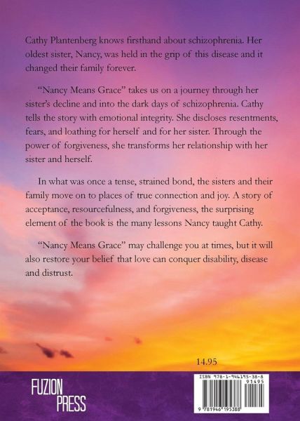 Cathy Plantenberg knows firsthand about schizophrenia. Her oldest sister, Nancy, was held in the grip of this disease and it changed their family forever. "Nancy Means Grace" takes us on a journey through her sister’s decline and into the dark days of schizophrenia. Cathy tells the story with emotional integrity. She discloses resentments, fears, and loathing for herself and for her sister. Through the power of forgiveness, she transforms her relationship with her sister and herself. In what was once a tense, strained bond, the sisters and their family move on to places of true connection and joy. A story of acceptance, resourcefulness, and forgiveness, the surprising element of the book is the many lessons Nancy taught Cathy. "Nancy Means Grace" may challenge you at times, but it will also restore your belief that love can conquer disability, disease and distrust.