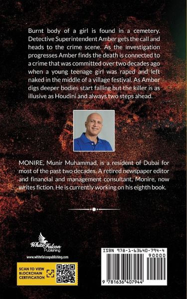 Burnt body of a girl is found in a cemetery. Detective Superintendent Amber gets the call and heads to the crime scene. As the investigation progresses Amber finds the death is connected to a crime that was committed over two decades ago when a young teenage girl was raped and left naked in the middle of a village festival. As Amber digs deeper bodies start falling but the killer is as illusive as Houdini and always two steps ahead. About the Author: MONIRE, Munir Muhammad, is a resident of Dubai for most of past two decades. A retired newspaper editor and financial and management consultant, Monire, now writes fiction. He is currently working on his 8th book.