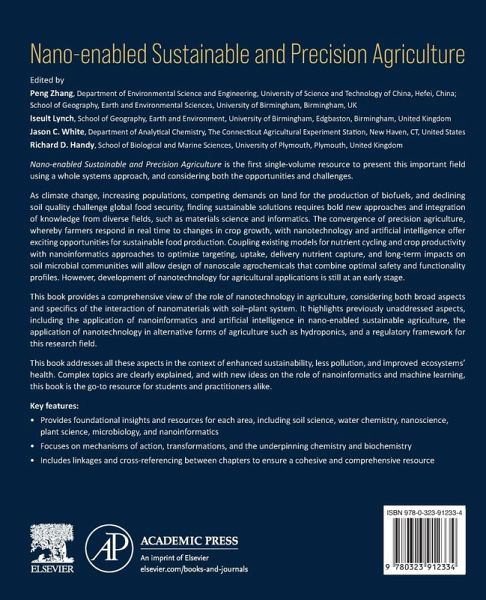 Nano-enabled Sustainable and Precision Agriculture is the first single-volume resource to cover this important field using a whole systems approach that considers both opportunities and challenges. The book provides a comprehensive understanding of the role of nanotechnology in agriculture from broad aspects, but also includes a comprehensive view of the interaction of nanomaterials with soil-plant systems. It highlights aspects not described in previous books, including the application of nanoinformatics and artificial intelligence in nano-enabled sustainable agriculture, the application of nanotechnology in alternative forms of agriculture such as hydroponics, and regulatory frameworks for this research field. The book addresses all these aspects by including sections on enhanced sustainability, reduced pollution and enhanced ecosystems' health, and the role of nanoinformatics and machine learning.