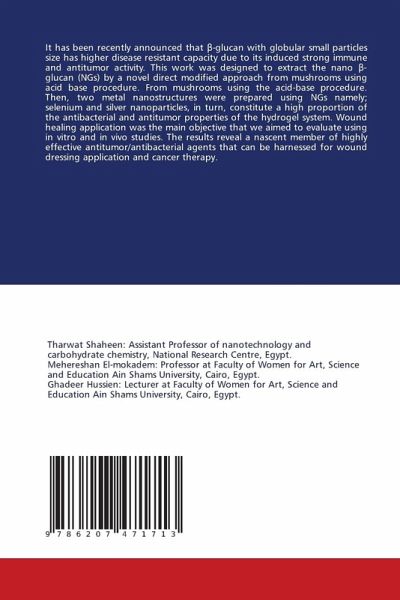It has been recently announced that beta-glucan with globular small particles size has higher disease resistant capacity due to its induced strong immune and antitumor activity. This work was designed to extract the nano beta-glucan (NGs) by a novel direct modified approach from mushrooms using acid base procedure. From mushrooms using the acid-base procedure. Then, two metal nanostructures were prepared using NGs namely; selenium and silver nanoparticles, in turn, constitute a high proportion of the antibacterial and antitumor properties of the hydrogel system. Wound healing application was the main objective that we aimed to evaluate using in vitro and in vivo studies. The results reveal a nascent member of highly effective antitumor/antibacterial agents that can be harnessed for wound dressing application and cancer therapy.