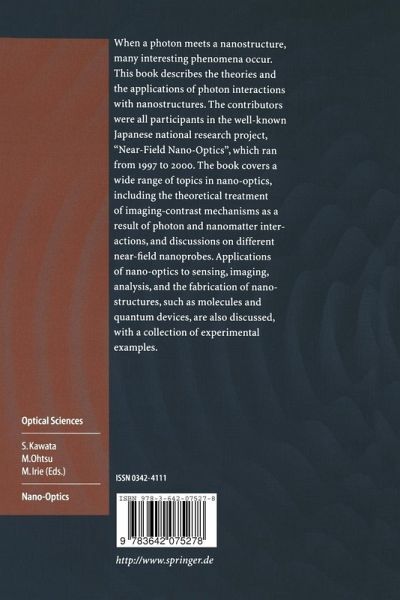 When a photon meets a nanostructure, many interesting phenomena occur. This book aims at developing the theories and the applications of photon interactions with nanostructures. The contributors were all participants in the well-known Japanese national research project, "Near-Field Nano-Optics", which ran from 1997 to 2000. The book covers a wide range of disciplines in nano-optics, including the theoretical development of imaging-contrast mechanisms as a result of photon and nanomatter interactions, and discussions on different near-field nanoprobes. Applications of nano-optics to sensing, imaging, analysis, and the fabrication of nanostructures, such as molecules and quantum devices, are also discussed, with a collection of experimental examples.