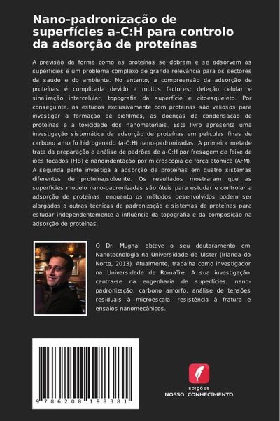 A previsão da forma como as proteínas se dobram e se adsorvem às superfícies é um problema complexo de grande relevância para os sectores da saúde e do ambiente. No entanto, a compreensão da adsorção de proteínas é complicada devido a muitos factores: deteção celular e sinalização intercelular, topografia da superfície e citoesqueleto. Por conseguinte, os estudos exclusivamente com proteínas são valiosos para investigar a formação de biofilmes, as doenças de condensação de proteínas e a toxicidade dos nanomateriais. Este livro apresenta uma investigação sistemática da adsorção de proteínas em películas finas de carbono amorfo hidrogenado (a-C:H) nano-padronizadas. A primeira metade trata da preparação e análise de padrões de a-C:H por fresagem de feixe de iões focados (FIB) e nanoindentação por microscopia de força atómica (AFM). A segunda parte investiga a adsorção de proteínas em quatro sistemas diferentes de proteína/solvente. Os resultados mostraram que as superfícies modelo nano-padronizadas são úteis para estudar e controlar a adsorção de proteínas, enquanto os métodos desenvolvidos podem ser alargados a outras técnicas de padronização e sistemas de proteínas para estudar independentemente a influência da topografia e da composição na adsorção de proteínas.