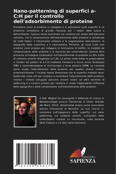 Prevedere come le proteine si ripiegano e si adsorbono sulle superfici è un problema complesso di grande rilevanza per i settori della salute e dell'ambiente. Spesso viene esaminato nel contesto più ampio dell'adesione cellulare, ma la comprensione dell'adsorbimento delle proteine è complicata da molti fattori: il rilevamento cellulare e la segnalazione intercellulare, la topografia della superficie e il citoscheletro. Pertanto, gli studi sulle sole proteine sono preziosi per indagare la formazione di biofilm, le malattie da condensazione delle proteine e la tossicità dei nanomateriali. Questo libro presenta un'indagine sistematica sull'adsorbimento di proteine su film sottili di carbonio amorfo idrogenato (a-C:H). La prima metà tratta la preparazione e l'analisi dei pattern di a-C:H mediante fresatura a fascio ionico focalizzato (FIB) e nanoindentazione al microscopio a forza atomica (AFM). La seconda parte studia l'adsorbimento delle proteine per quattro diversi sistemi proteina/solvente. I risultati hanno dimostrato che le superfici modello nano-patternate sono utili per studiare e controllare l'adsorbimento delle proteine, mentre i metodi sviluppati possono essere estesi ad altre tecniche di patterning e a sistemi proteici per studiare in modo indipendente l'influenza della topografia e della composizione sull'adsorbimento delle proteine.