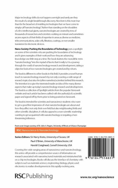 Part I: The Nanotechnologist's Toolbox Chapter 1: How can you 'see', 'feel' or 'hear' something so incredibly tiny? Chapter 2: Building nanostructures from the top down and from the bottom up Chapter 3: Techniques and concepts for the nanotechnologist Chapter 4: Learning from Mother Nature Chapter 5: Amazing new materials Chapter 6: Tiny steps towards tiny machines Part II: Nanomedicine - Death of the slasher Chapter 7: The radically different medicine of the future Chapter 8: Improved diagnostics - key to effective prevention Chapter 9: The fight against cancer Chapter 10: Next-generation implants, prostheses and other cures Chapter 11: Concepts a bit further out Part III: Simply Green - Environmental Applications and Risk Management Chapter 12: Green nanotechnology Chapter 13: Dealing with pollution Chapter 14: Energy - renewable and clean Chapter 15: Nanotoxicology - assessing the risks Part IV: A World of Novel Applications Awaits Chapter 16: Designing tomorrow's computer Chapter 17: Electronics beyond silicon Chapter 18: From supermarket shelf to spacecraft