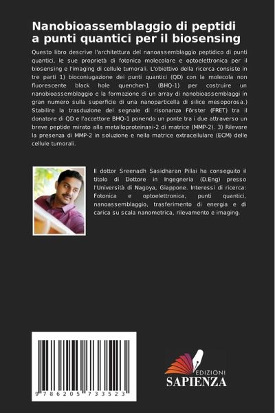 Questo libro descrive l'architettura del nanoassemblaggio peptidico di punti quantici, le sue proprietà di fotonica molecolare e optoelettronica per il biosensing e l'imaging di cellule tumorali. L'obiettivo della ricerca consiste in tre parti 1) bioconiugazione dei punti quantici (QD) con la molecola non fluorescente black hole quencher-1 (BHQ-1) per costruire un nanobioassemblaggio e la formazione di un array di nanobioassemblaggi in gran numero sulla superficie di una nanoparticella di silice mesoporosa.) Stabilire la trasduzione del segnale di risonanza F¿rster (FRET) tra il donatore di QD e l'accettore BHQ-1 ponendo un ponte tra i due attraverso un breve peptide mirato alla metalloproteinasi-2 di matrice (MMP-2). 3) Rilevare la presenza di MMP-2 in soluzione e nella matrice extracellulare (ECM) delle cellule tumorali.