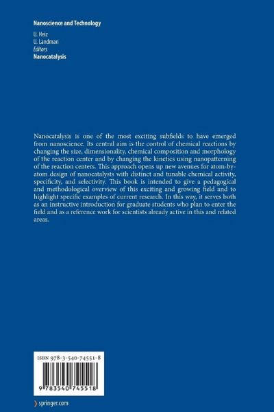 Nanocatalysis is one of the most exciting subfields to have emerged from nanoscience. Its central aim is the control of chemical reactions by changing the size, dimensionality, chemical composition and morphology of the reaction center and by changing the kinetics using nanopatterning of the reaction centers. This approach opens up new avenues for atom-by-atom design of nanocatalysts with distinct and tunable chemical activity, specificity, and selectivity. This book is intended to give a pedagogical and methodological overview of this exciting and growing field and to highlight specific examples of current research. In this way, it serves both as an instructive introduction for graduate students who plan to enter the field and as a reference work for scientists already active in this and related areas.