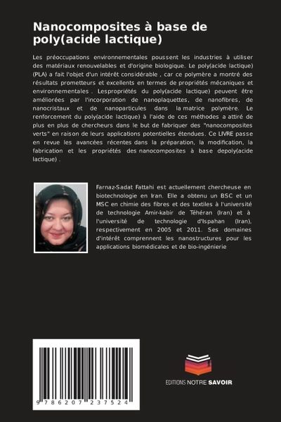 Les préoccupations environnementales poussent les industries à utiliser des matériaux renouvelables et d'origine biologique. Le poly(acide lactique) (PLA) a fait l'objet d'un intérêt considérable , car ce polymère a montré des résultats prometteurs et excellents en termes de propriétés mécaniques et environnementales . Lespropriétés du poly(acide lactique) peuvent être améliorées par l'incorporation de nanoplaquettes, de nanofibres, de nanocristaux et de nanoparticules dans la matrice polymère. Le renforcement du poly(acide lactique) à l'aide de ces méthodes a attiré de plus en plus de chercheurs dans le but de fabriquer des "nanocomposites verts" en raison de leurs applications potentielles étendues. Ce LIVRE passe en revue les avancées récentes dans la préparation, la modification, la fabrication et les propriétés des nanocomposites à base depoly(acide lactique) .