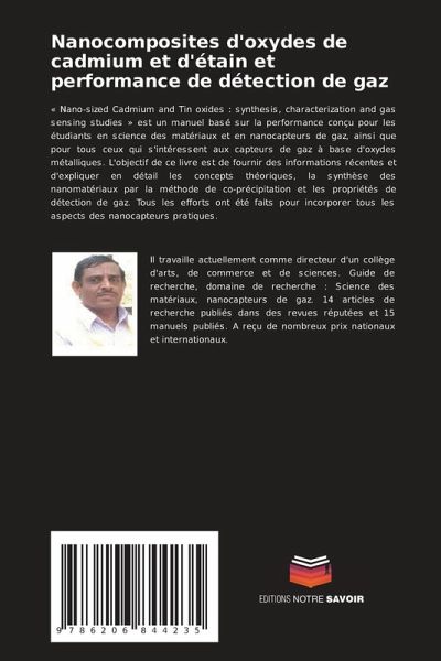 « Nano-sized Cadmium and Tin oxides : synthesis, characterization and gas sensing studies » est un manuel basé sur la performance conçu pour les étudiants en science des matériaux et en nanocapteurs de gaz, ainsi que pour tous ceux qui s'intéressent aux capteurs de gaz à base d'oxydes métalliques. L'objectif de ce livre est de fournir des informations récentes et d'expliquer en détail les concepts théoriques, la synthèse des nanomatériaux par la méthode de co-précipitation et les propriétés de détection de gaz. Tous les efforts ont été faits pour incorporer tous les aspects des nanocapteurs pratiques.