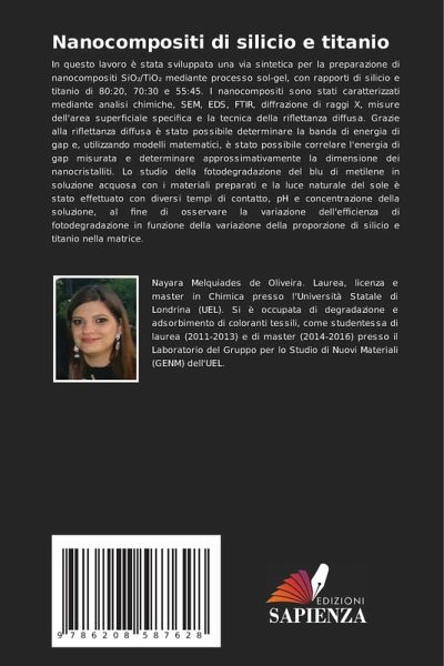 In questo lavoro è stata sviluppata una via sintetica per la preparazione di nanocompositi SiO¿/TiO¿ mediante processo sol-gel, con rapporti di silicio e titanio di 80:20, 70:30 e 55:45. I nanocompositi sono stati caratterizzati mediante analisi chimiche, SEM, EDS, FTIR, diffrazione di raggi X, misure dell'area superficiale specifica e la tecnica della riflettanza diffusa. Grazie alla riflettanza diffusa è stato possibile determinare la banda di energia di gap e, utilizzando modelli matematici, è stato possibile correlare l'energia di gap misurata e determinare approssimativamente la dimensione dei nanocristalliti. Lo studio della fotodegradazione del blu di metilene in soluzione acquosa con i materiali preparati e la luce naturale del sole è stato effettuato con diversi tempi di contatto, pH e concentrazione della soluzione, al fine di osservare la variazione dell'efficienza di fotodegradazione in funzione della variazione della proporzione di silicio e titanio nella matrice.