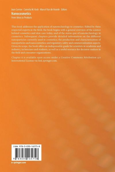 Introduction to Nanocosmetics: Science Behind Cosmetics and Skin Care,- Nanotechnology in Cosmetics. Nanoparticles in cosmetics: Inorganic nanoparticles in cosmetics: Micelles and Nanoemulsions.- Polymeric nanoparticles.- Phospholipids in Cosmetic Carriers.- SmartLipids - the third generation of solid submicron lipid particles for dermal delivery of actives.- Nanocrystals for dermal application. Characterization and Production of Nanoparticles and Nanocosmetics: Characterization of nanoparticles for cosmetic applications.- Characterization of Nanoparticles in Dermal Formulations.- Characterization of penetration of particles after dermal application.- Characterisation of Nanomaterials with Focus on Metrology, Nano Reference Materials and Standardisation.- Production of nanocosmetics. Governance and Potentials of Nanocosmetics: Safety and Toxicity counts of Nanocosmetics.- Regulation of nanomaterials in cosmetic products on the EU market.- Why Nanotechnology in Dermal Products? - Advantages, Challenges and Market Aspects.