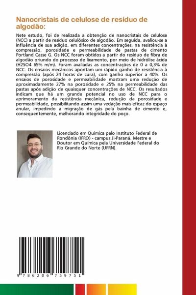 Nete estudo, foi de realizada a obtenção de nanocristais de celulose (NCC) a partir de resíduo celulósico de algodão. Em seguida, avaliou-se a influência de sua adição, em diferentes concentrações, na resistência à compressão, porosidade e permeabilidade de pastas de cimento Portland Casse G. Os NCC foram obtidos a partir do resíduo de fibra de algodão oriundo do processo de lixamento, por meio de hidrólise ácida (H2SO4 65% m/m). Foram avaliadas as concentrações de 0 a 0,3% de NCC. Os ensaios mecânicos apontam um rápido ganho de resistência à compressão (após 24 horas de cura), com ganho superior a 40%. Os ensaios de porosidade e permeabilidade mostram uma redução de aproximadamente 27% na porosidade e 25% na permeabilidade das pastas após adição de quaisquer concentrações de NCC. Os resultados indicam que há um grande potencial no uso de NCC para o aprimoramento da resistência mecânica, redução da porosidade e permeabilidade, possibilitando assim uma vedação mais eficaz do espaço anular, impedindo a migração de gás pela bainha de cimento e, consequentemente, melhorando integridade do poço.