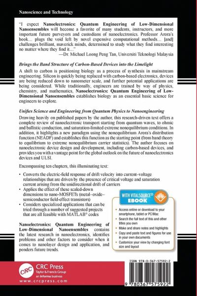 Brings the Band Structure of Carbon-Based Devices into the Limelight A shift to carbon is positioning biology as a process of synthesis in mainstream engineering. Silicon is quickly being replaced with carbon-based electronics, devices are being reduced down to nanometer scale, and further potential applications are being considered. While traditionally, engineers are trained by way of physics, chemistry, and mathematics, Nanoelectronics: Quantum Engineering of Low-Dimensional Nanoensembles establishes biology as an essential basic science for engineers to explore. Unifies Science and Engineering: from Quantum Physics to Nanoengineering Drawing heavily on published papers by the author, this research-driven text offers a complete review of nanoelectronic transport starting from quantum waves, to ohmic and ballistic conduction, and saturation-limited extreme nonequilibrium conditions. In addition, it highlights a new paradigm using non-equilibrium Arora's Distribution Function (NEADF) and establishes this function as the starting point (from band theory to equilibrium to extreme nonequilibrium carrier statistics). The author focuses on nano-electronic device design and development, including carbon-based devices, and provides you with a vantage point for the global outlook on the future of nanoelectronics devices and ULSI. Encompassing ten chapters, this illuminating text: Converts the electric-field response of drift velocity into current-voltage relationships that are driven by the presence of critical voltage and saturation current arising from the unidirectional drift of carriers Applies the effect of these scaled-down dimensions to nano-MOSFET (metal-oxide-semiconductor field-effect transistor) Considers specialized applications that can be tried through a number of suggested projects that are all feasible with MATLAB® codes Nanoelectronics: Quantum Engineering of Low-Dimensional Nanoensembles contains the latest research in nanoelectronics, identifies problems and other factors to consider when it comes to nanolayer design and application, and ponders future trends. Print Versions of this book also include access to the ebook version.