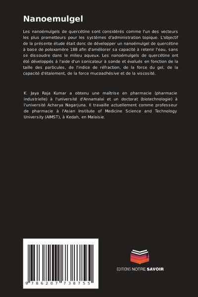 Les nanoémulgels de quercétine sont considérés comme l'un des vecteurs les plus prometteurs pour les systèmes d'administration topique. L'objectif de la présente étude était donc de développer un nanoémulgel de quercétine à base de poloxamère 188 afin d'améliorer sa capacité à retenir l'eau, sans se dissoudre dans le milieu aqueux. Les nanoémulgels de quercétine ont été développés à l'aide d'un sonicateur à sonde et évalués en fonction de la taille des particules, de l'indice de réfraction, de la force du gel, de la capacité d'étalement, de la force mucoadhésive et de la viscosité.