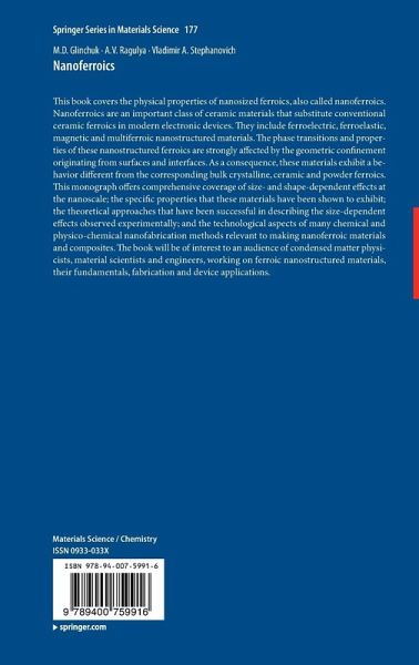 From the Contents: Ferroics.- The definition and classification of ferroics.- The main peculiarities of nanoferroics properties.- Physical factors defining the nanoferroics properties.- Theoretical description of primary nanoferroics. Comparison of the theory with experiment.- Surface tension contribution to the properties of nanoferroics.- True nanoferroics with properties absent in the bulk materials.- Synthesis and fabrication of nanoferroics.- Classification of the methods of nanoferroics fabrication.